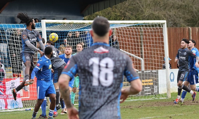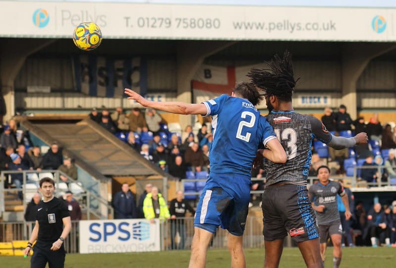 The match located just a stone’s throw away from Stanstead Airport, started with early pressure by a Blues side who had only picked up four points in their previous five. A Stortford throw in was knocked out of play for a Yeltz one by Fabio Virciglio. The Rob Evans long throw was directed in towards Ryan Wollacott at the front post. The ball missed him and tried to reach Jason Cowley, but it bounced out for a goal kick to the hosts.