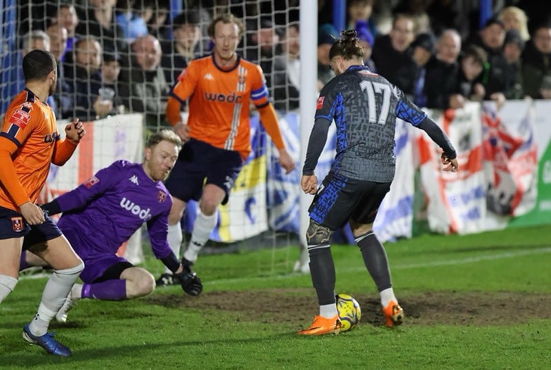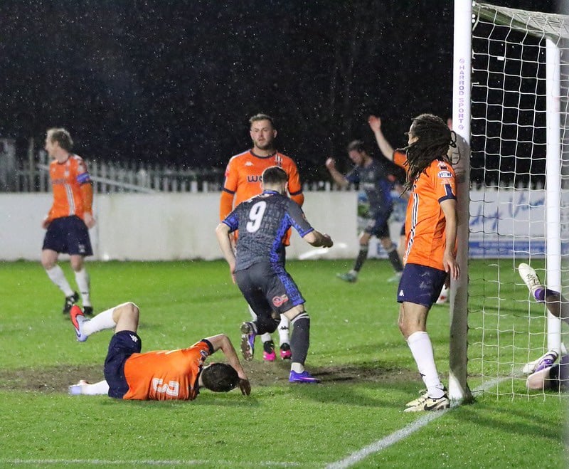 The half way stage was where the rain and wind really started to pierce the grass on the pitch, and blow the flag down by the corner spots, and the wind in our sails certainly didn’t give up. 22 minutes on the clock, a cross from Cowley down the right was whipped high and wide to Jordan Ponticelli at the back post, who had two bites at the cherry, but Stratford stuck two blocks in to keep the game goal less.